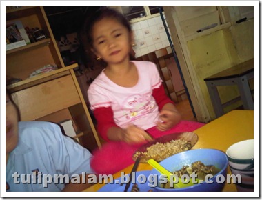 Ni hah tetamu cilik kitorang, si Puteri Hang Li Po. Dah byk kali gak dia berbuka dgn kitorang tapi tak amik pic pun. Malu katanya. Ni pun candid yg akhirnya dia perasan. Tu yg muka jadi gitu tuh. Hehehe. Tetamu cilik tgh menyedut siput sedut. Two days in a row dia suruh mamanya beli. Nasib baik lah ada org jual. Tapi tak se kawwww neneknya yg masak. Dia pun tau complaint ko. hahaha