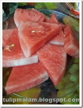 Kurma dan tembikai memang wajib ada waktu berbuka. Tembikai tu HD ngan Adik je yang dok mengerjakan. Sahur kami tak makan nasi. Minum milo + makan kurma + yogurt jek. Abang lagilah tak mahu makan.